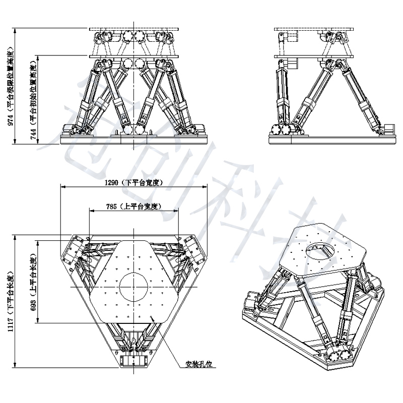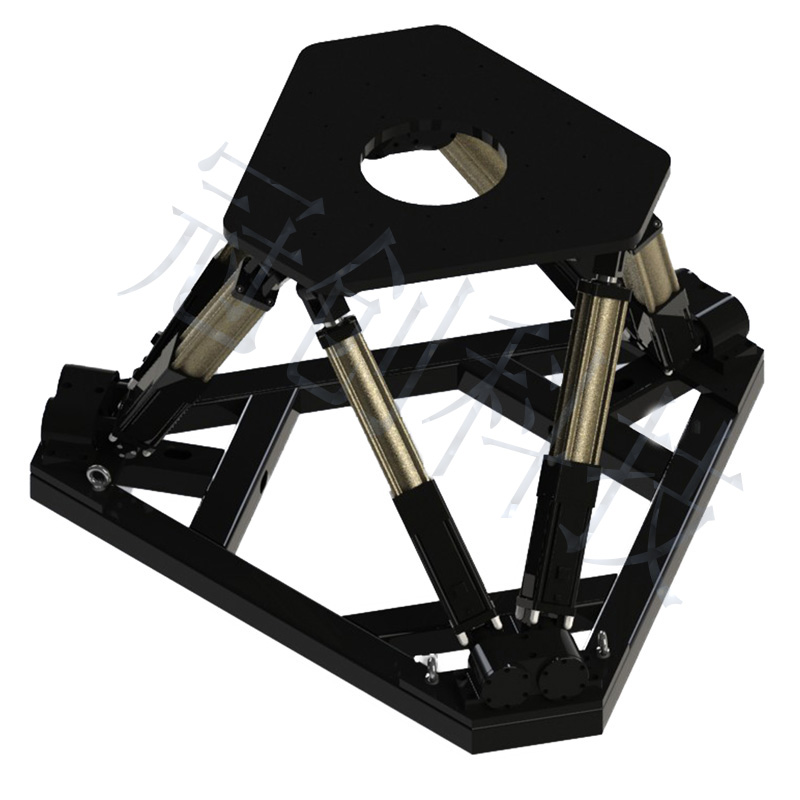 六只电动缸支承,运动平台与电动缸采用六个虎克铰连接,